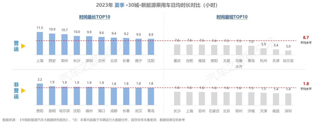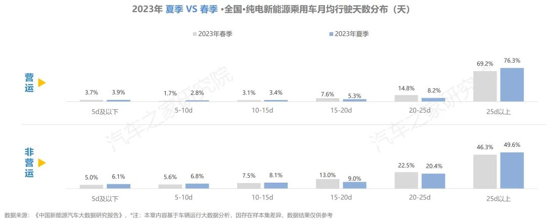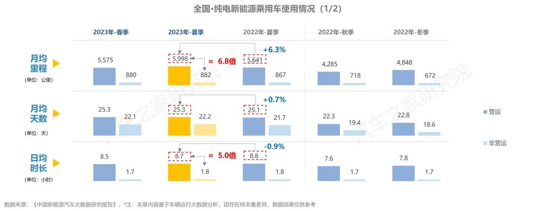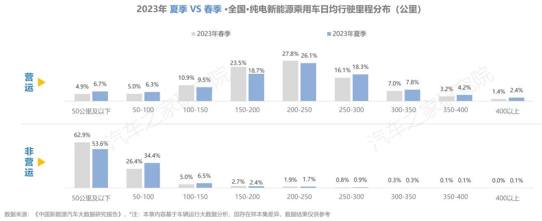 與去年同期相比,純電車輛在行駛里程有所增加,在出行天數(shù)與行駛時(shí)長方面,同去年夏季相比大體持平。而從不同車輛性質(zhì)對(duì)比上看,營運(yùn)車輛的使用強(qiáng)度遠(yuǎn)超非營運(yùn)車輛,兩者在行駛里程方面相差超6倍,在日均時(shí)長則亦有近5倍的差距。
