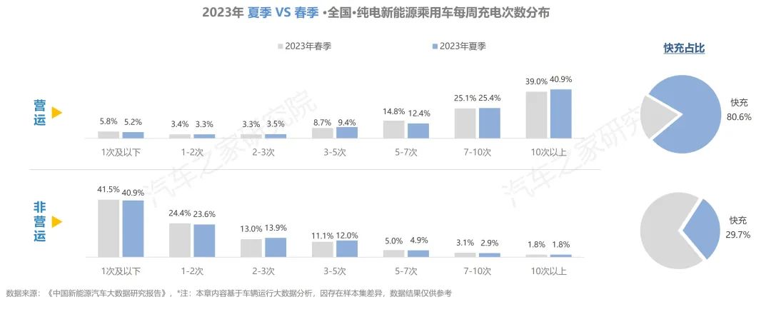 純電營運(yùn)車輛每周充電超過7次的占比超過60%,且在所有的補(bǔ)能行為中,使用快充的占比高達(dá)80%。非營運(yùn)車輛中超四成的車輛,每周僅充電1次,選擇快充方式補(bǔ)能的占比不足30%。