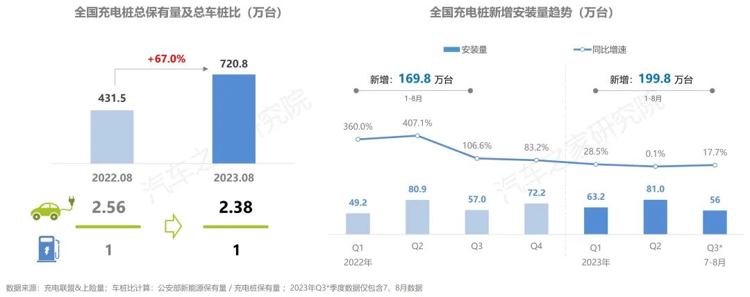 截止2023年8月,全國充電基礎(chǔ)設(shè)施累計(jì)數(shù)量為720萬臺(tái),同比增加67.0%,車樁比為2.38,較去年同期與今年二季度的2.43均繼續(xù)下降。從充電設(shè)施建設(shè)上看,今年1-8月,充電樁新增安裝近200萬臺(tái),新增安裝數(shù)量超越去年同期,7-8月充電樁安裝56萬臺(tái),與今年二季度相比增速再次抬頭。
