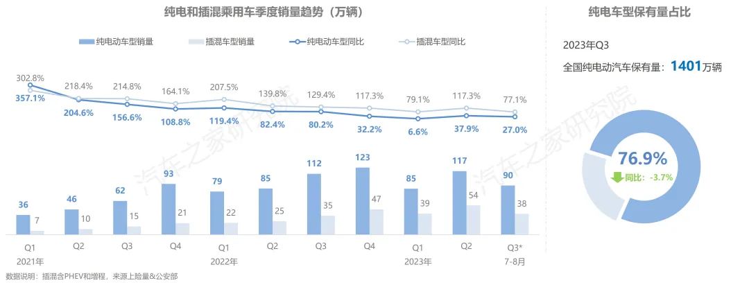 從新能源市場(chǎng)發(fā)展的趨勢(shì)上看,隨著技術(shù)的日漸成熟與明星車型的不斷涌現(xiàn),插混及增程車型的市場(chǎng)銷量增速長期處于領(lǐng)跑位置,純電車型市場(chǎng)增速相對(duì)較弱。而從絕對(duì)增量與存量兩個(gè)角度上看,新能源市場(chǎng)的大部分份額仍由純電車型所占據(jù),但市場(chǎng)正處于被緩慢的蠶食之中,目前全國純電動(dòng)汽車保有量為1400萬輛,占全部新能源車保有量的近77%。