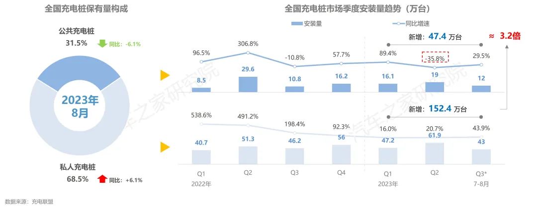 從結(jié)構(gòu)上看,私樁是目前新能源汽車補(bǔ)能的主要方式,占據(jù)充電樁近7成的保有量,而且發(fā)展增速更快。2023年1-8月,公共充電樁新增安裝47.4萬臺(tái),7-8月安裝12萬臺(tái),新增安裝量已超過去年整體Q3增量規(guī)模,恢復(fù)上行態(tài)勢(shì),但其增量水平與整體規(guī)模,同私人充電樁規(guī)模相比差距增大。