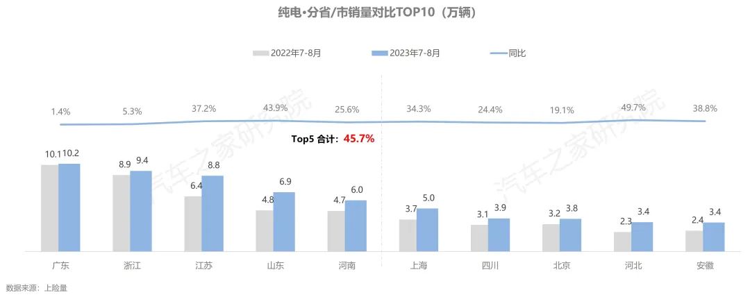 從省份角度看,在排名前五的省份中,廣東省是唯一銷量超過10萬輛的省份,繼續(xù)占據(jù)首位,排名第二至第五名的浙江、江蘇、山東、河南,五省合計(jì)占近50%的全國市場(chǎng)份額。排名前10的省份中,山東、河北省的市場(chǎng)成長性最為優(yōu)異,今年7-8月銷量同比增速近50%。
