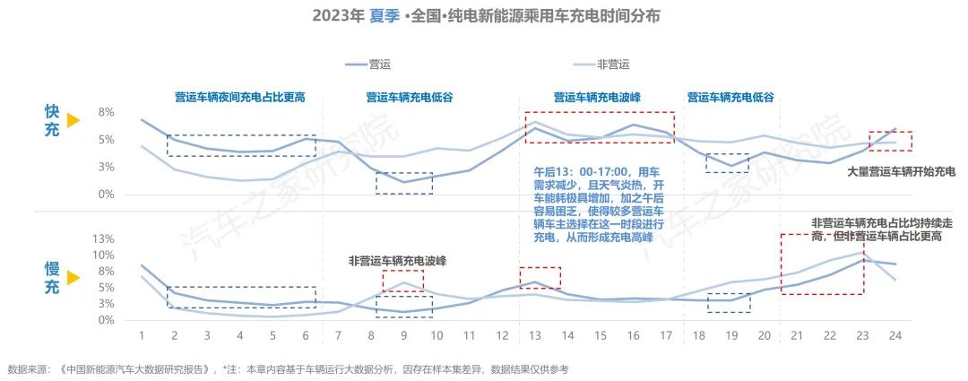 從充電開始時(shí)間上看,營運(yùn)車輛在充電時(shí),快充與慢充的波峰、波谷時(shí)間基本一致。早9時(shí)與晚19時(shí)是營運(yùn)車輛充電的低谷,同時(shí)夜間充電比例更高。此外,由于午后用車需求減少,且夏季天氣炎熱,開車能耗大幅增加,加之午后容易困乏,使得較多車主選擇在下午13-17時(shí)進(jìn)行快充補(bǔ)能,從而形成充電高峰。當(dāng)選擇慢充進(jìn)行補(bǔ)能時(shí),非營運(yùn)車輛第一次充電高峰出現(xiàn)在上午9時(shí)而后快速回落,第二次是從19時(shí)開始一路攀升,至23時(shí)到達(dá)頂點(diǎn),開始充電時(shí)間與營運(yùn)車輛相比明顯更早。