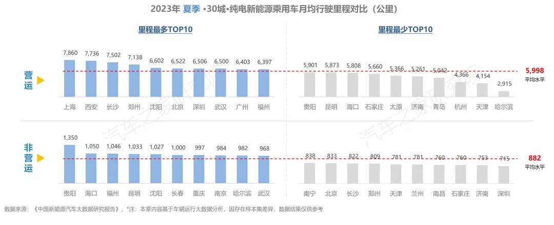 30個(gè)城市中,上海、西安等4個(gè)城市營運(yùn)車輛月均行駛里程超過7000公里,與春季僅有兩個(gè)城市超7000公里相比,數(shù)量有所增加。非營運(yùn)車輛行駛最多的是貴陽,月均里程超1300公里,遠(yuǎn)超其他城市,其余城市家用純電車型行駛里程差距較小,深圳私家車主跑的最少。