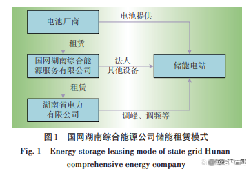 在工商業(yè)用戶市場(chǎng),美國(guó)的AMS公司向用戶提供儲(chǔ)能租賃服務(wù)以幫助用戶節(jié)省電費(fèi)支出。針對(duì)新能源消納空間不足以及新能源發(fā)電企業(yè)自配儲(chǔ)能困難的問(wèn)題,國(guó)網(wǎng)湖南綜合能源公司于2020年11月發(fā)布儲(chǔ)能設(shè)備租賃招標(biāo)公告,首創(chuàng)電池租賃模式,該運(yùn)營(yíng)模式如圖1所示。