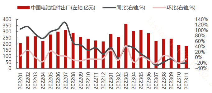 產(chǎn)業(yè)鏈出海維度,11月我國太陽能電池(含組件)出口金額183.06億元,同比-19.73%、環(huán)比-5.14%,自10月以來單月出口額繼續(xù)低于200億元,但同環(huán)比降幅相較10月份均有所收窄。11月逆變器出口40.22億元,同比-45.94%,環(huán)比+0.91%,環(huán)比迎來自6月以來的首次由負轉正。