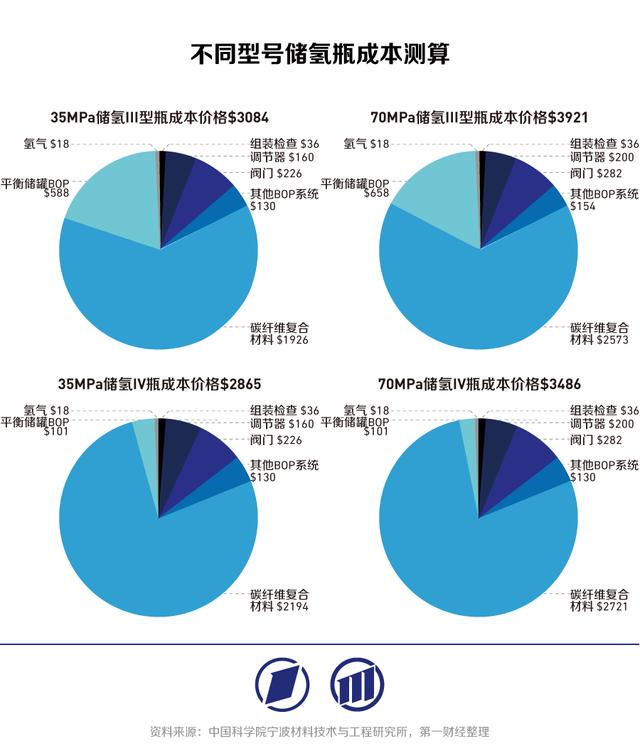 ?、粜蛢淦坎粌H性能更優(yōu),成本也低于Ⅲ型儲氫瓶。根據(jù)中國科學(xué)院寧波材料技術(shù)與工程研究所近期的測算,35MPa、70MPa的儲氫Ⅲ型瓶成本價格分別為3084美元、3921美元,而35MPa、70MPa的儲氫Ⅳ型瓶成本價格分別為2865美元和3486美元,分別低7%和11%。