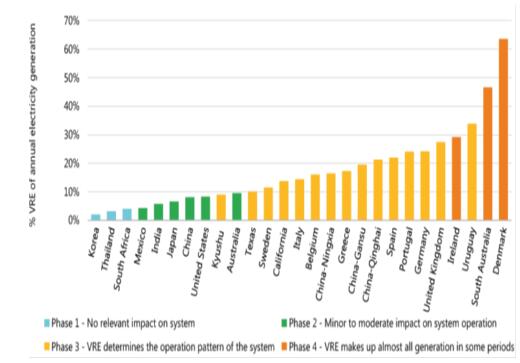 圖1 不同國家/地區(qū)波動(dòng)性可再生能源發(fā)電占比及相應(yīng)的系統(tǒng)集成階段(2018年)