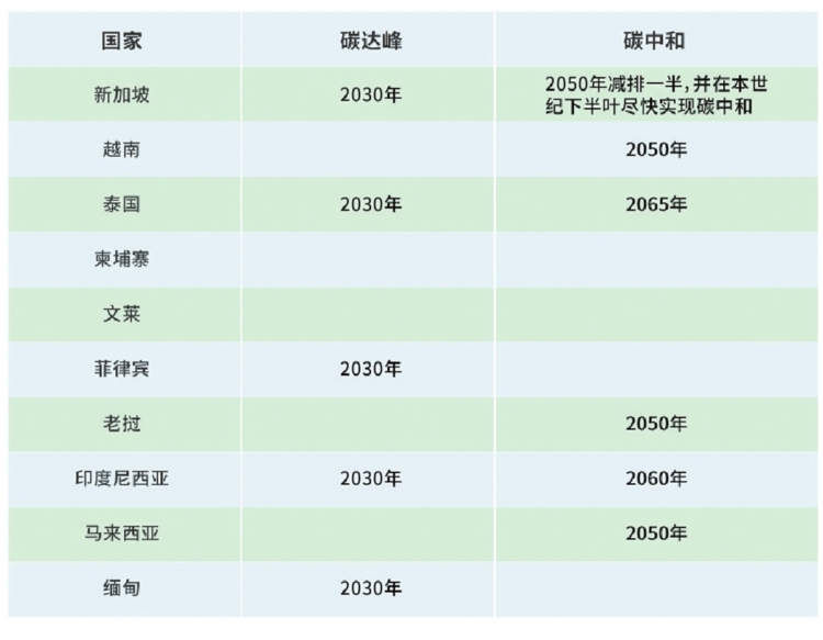 東盟各國碳達峰碳中和承諾時間表 (數據來源:各國自主貢獻目標、中長期減排發(fā)展戰(zhàn)略)