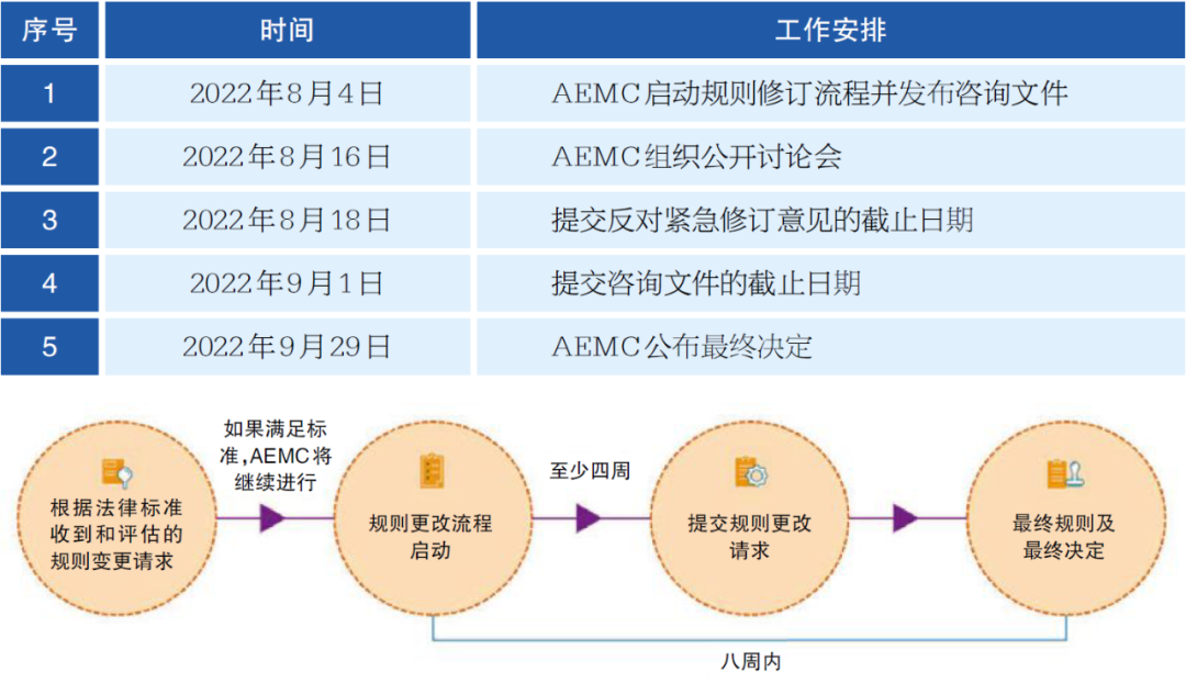 7月21日,AEMC發(fā)布《啟動(dòng)和加快修訂APC規(guī)則修訂意向的預(yù)先通知》。8月4日,AEMC啟動(dòng)了APC規(guī)則緊急修訂流程,公開(kāi)發(fā)布咨詢文件以便利益相關(guān)者參與其中。按照法律規(guī)定,緊急修訂流程下只有一輪咨詢,并且AEMC必須在規(guī)則修訂流程開(kāi)始后的八周內(nèi)(最晚9月29日)公布其最終決定。