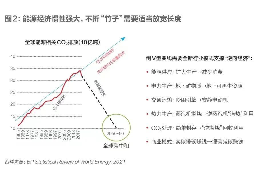 這個(gè)倒V型曲線需要全新的商業(yè)模式來支持逆向經(jīng)濟(jì),即所有的能源供應(yīng)、電力生產(chǎn)等都要反過來,要從賣碳排碳賺錢的商業(yè)模式變成埋碳減碳賺錢的商業(yè)模式。