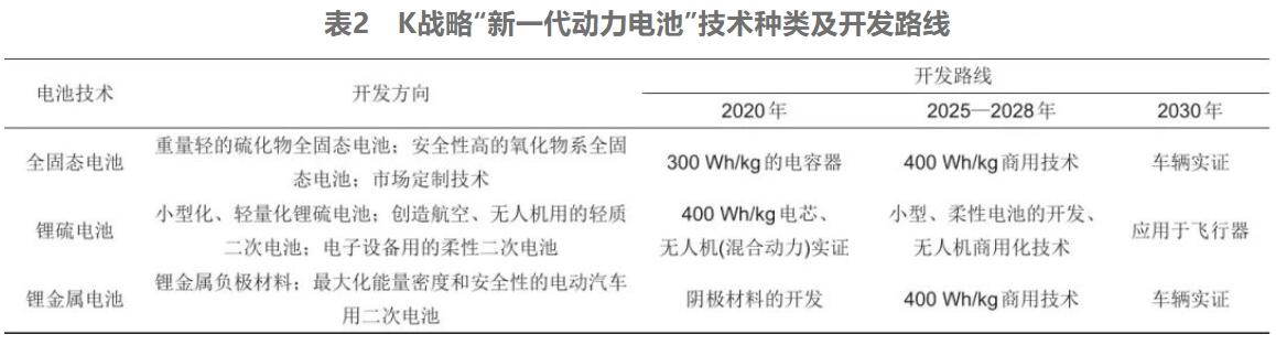 圍繞下一代動(dòng)力電池技術(shù),韓國政府將拉動(dòng)公私合作,支持大規(guī)模電池研發(fā)。K戰(zhàn)略中,韓國政府對研發(fā)路線進(jìn)行了規(guī)劃,主要圍繞新一代電池制造技術(shù)以及實(shí)現(xiàn)全固態(tài)電池、鋰硫電池、鋰金屬電池的商用化,如表2所示。