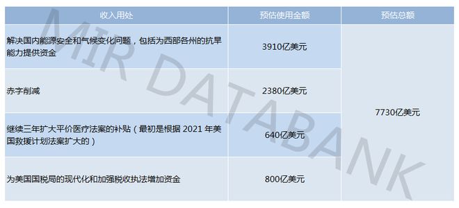IRA法案的實施是政治家們的游戲,但透過政治博弈的波譎云詭,人們更關心的是法案本身到底在傳達什么信息。簡單來說,IRA法案旨在通過減少赤字、降低處方藥價格、投資國內能源生產以及促進清潔能源產業(yè)來遏制通膨。以上的想法是偉大的,但是美國目前國家債務高筑,聯邦政府連年擴大赤字,美國的國家總債務限額屢屢被觸及,需要提高債務上限。這項宏大的新能源投資刺激法案的錢從哪來?又被具體分配到哪些領域? 這些問題由MIR睿工業(yè)通過對法案原文的解讀總結出下列圖表: