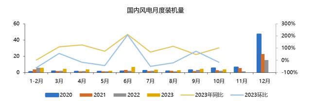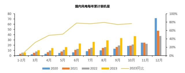 根據(jù)最新10月風(fēng)電裝機(jī)數(shù)據(jù),2023年1-10月,國(guó)內(nèi)新增風(fēng)電裝機(jī)37.31GW,同比增長(zhǎng)76%,單10月新增裝機(jī)達(dá)到3.83GW,同比增長(zhǎng)102%,環(huán)比下降16%??梢钥闯鰺o論單月裝機(jī)量還是累計(jì)規(guī)模都要遠(yuǎn)優(yōu)于去年,側(cè)面印證國(guó)內(nèi)風(fēng)電可能迎來了拐點(diǎn)。