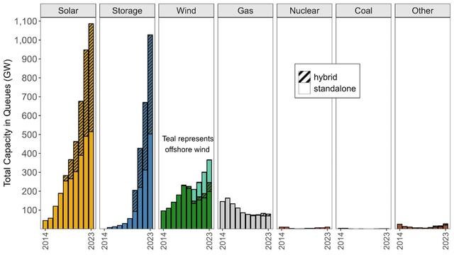 根據(jù)該報告,美國各地新能源發(fā)電和儲能項(xiàng)目的積壓問題進(jìn)一步加劇。截至2023年底,有近2600GW的發(fā)電和儲能容量正在尋求接入電網(wǎng),是現(xiàn)有美國電廠裝機(jī)總量的兩倍有余,其中超過95%容量來自于清潔能源項(xiàng)目。