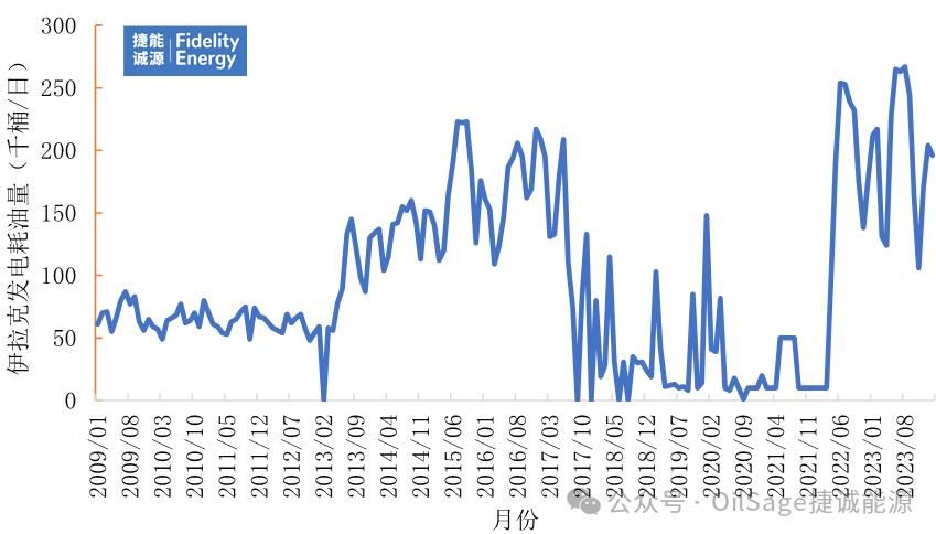 由于天然氣發(fā)電量不足,伊拉克發(fā)電耗油量從2021年的2.4萬桶/日上升到2022年的14.9萬桶/日。2022年伊拉克報告的發(fā)電燃油總量大幅上升至約36萬桶/日,并在2023年6月創(chuàng)下53.5萬桶/日的歷史新高。