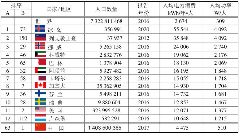 表中:A—表示人均能源和電力消費(fèi)最多的排序;B—表示該國(guó)電力產(chǎn)量的世界排序。