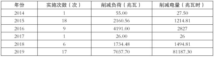 在需求響應實施早期,實施目的主要是為了應對夏季高峰時段電力消費緊張狀況,最大程度削減高峰電力負荷對電網安全的影響,保障了民生用電和重點用電安全平穩(wěn)。2014~2019年度國內開展削峰需求響應的情況如下表所示。