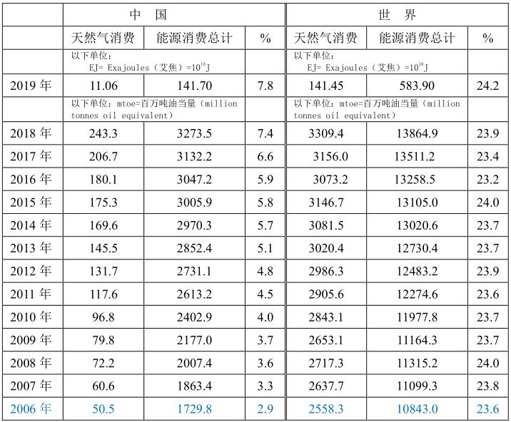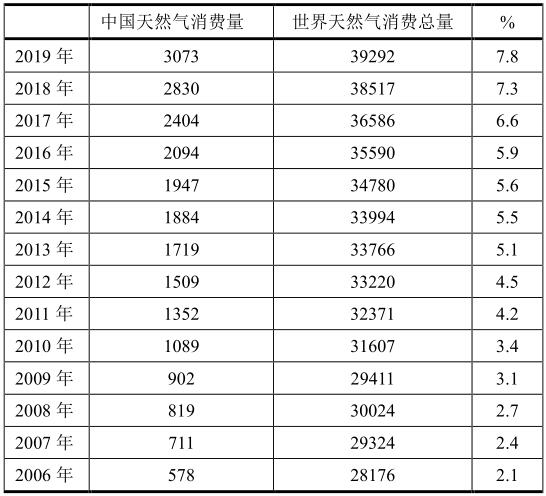 天然氣消費(fèi)量是指本國(guó)天然氣產(chǎn)量和進(jìn)口量之和。中國(guó)于2006年開(kāi)始LNG國(guó)際貿(mào)易,2010年管輸國(guó)際貿(mào)易開(kāi)始,因此從下表可以看出,2006年中國(guó)天然氣剛開(kāi)始進(jìn)口,消費(fèi)量?jī)H占世界天然氣消費(fèi)總量的2.1%,但隨著LNG和管輸國(guó)際貿(mào)易以來(lái),中國(guó)天然氣消費(fèi)量?jī)H占世界天然氣消費(fèi)總量的比例(%)逐年增加,到2019年中國(guó)天然氣消費(fèi)占世界消費(fèi)總量的比例已經(jīng)達(dá)到7.8%。