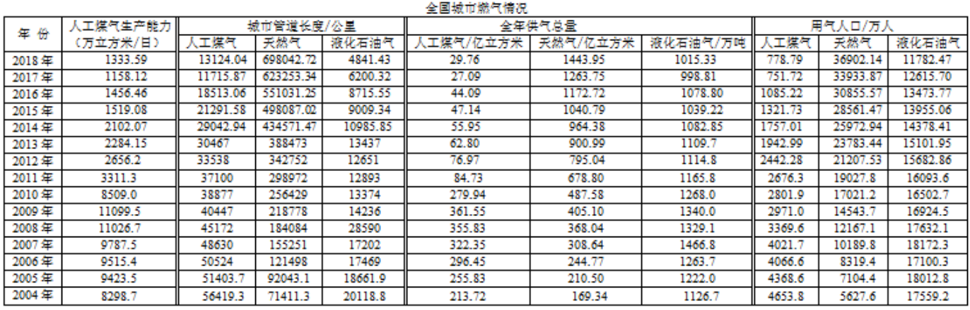 根據(jù)中國國家統(tǒng)計局的數(shù)據(jù)可以看出,在城市范圍內(nèi)人工煤氣的產(chǎn)量、管線長度和用氣人口在逐年下降,液化石油氣的管線長度和用氣人口也是逐年下降。而天然氣的城市管線長度、供氣量和用氣人口卻逐年上升。