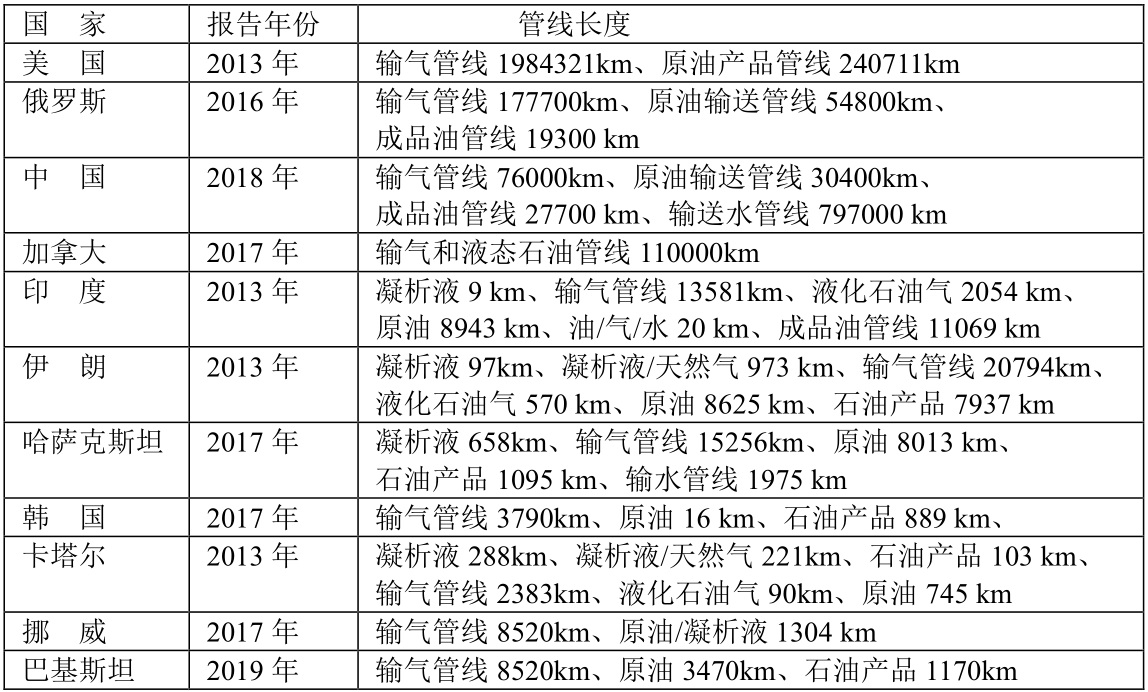 主要國家的油氣管線長度