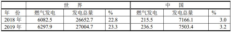 2019年全球燃氣發(fā)電占全球發(fā)電總量的份額為6297.9/27004.7=23.3%,而中國燃氣發(fā)電僅占本國發(fā)電總量的3.2%。