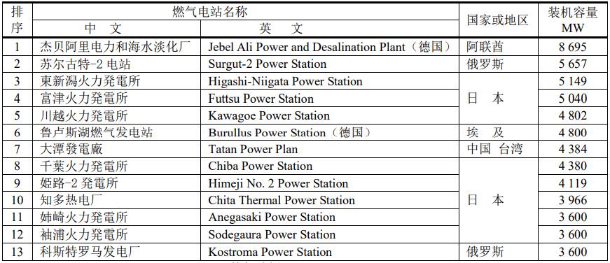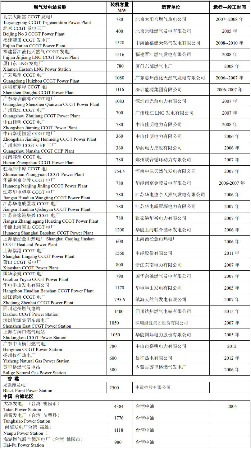 中國主要以燃煤發(fā)電為主,其次為燃氣發(fā)電的份額不高,但是進展比較快。目前中國燃氣發(fā)電站如表。