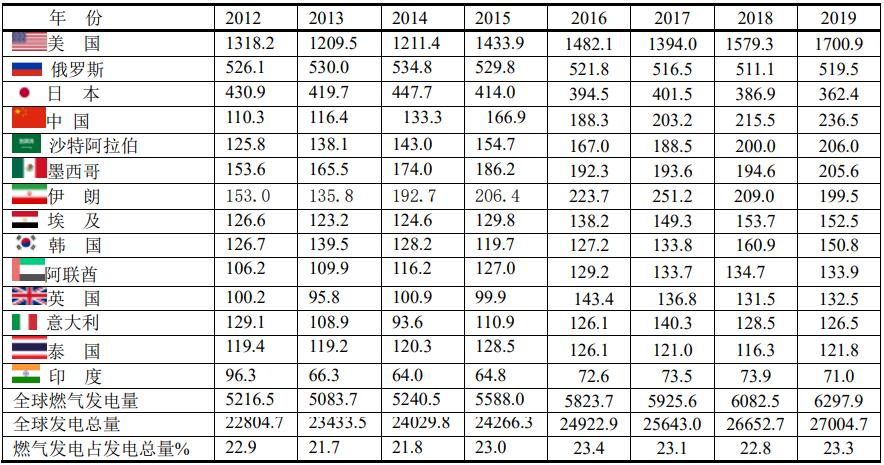 2016~2019年前14位燃氣發(fā)電量最大的國家(單位:TWh)