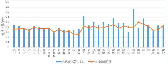 采用2019年各省光伏發(fā)電實(shí)際利用小時(shí)數(shù),計(jì)算了各省光伏發(fā)電的度電成本,與各省燃煤標(biāo)桿電價(jià)的對(duì)比如圖2所示。位于東北或西部地區(qū)的吉林、黑龍江、四川、青海、西藏、內(nèi)蒙古的度電成本已經(jīng)低于本省(區(qū))燃煤標(biāo)桿電價(jià)。另外,有8個(gè)省(區(qū)、市)的光伏度電成本高于燃煤基準(zhǔn)電價(jià)不足10%,也將很快實(shí)現(xiàn)平價(jià)。需要說(shuō)明的是,雖然一些省份光伏發(fā)電度電成本在全國(guó)已經(jīng)處于較低水平,但是與當(dāng)?shù)厝济簶?biāo)桿電價(jià)相比仍然沒有實(shí)現(xiàn)平價(jià)。