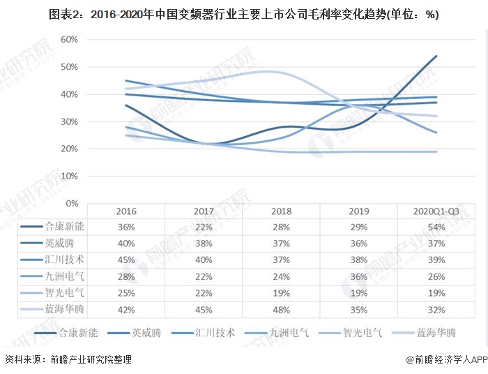 從我國上市公司近幾年的毛利率變化來看,變頻器行業(yè)主要上市公司的毛利率略有下降,但是整個行業(yè)的獲利水平較高,經(jīng)營效益良好。2018年,6家上市公司的毛利率維持在20%-50%之間;2019年,各公司的毛利率差異進(jìn)一步縮小,集中在30%-40%之間。2020年前三個季度,各公司的毛利率依然多集中在30%-40%之間。