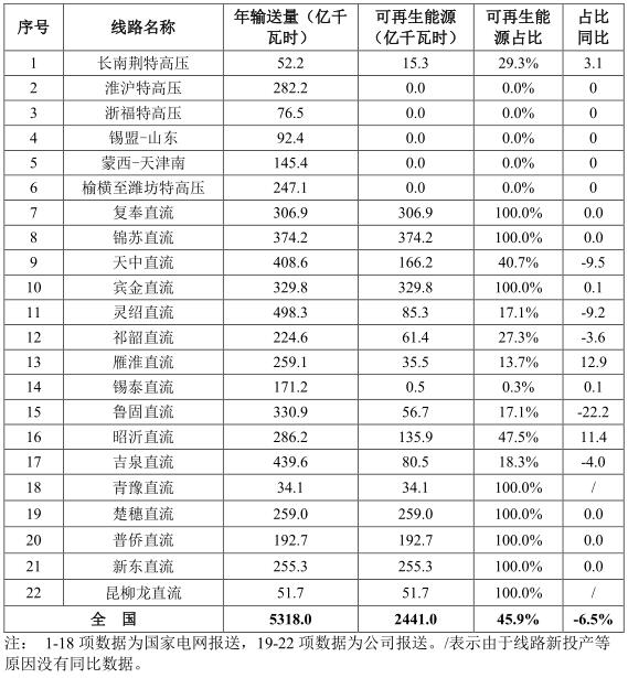 2020年,22條特高壓線路年輸送電量5318億千瓦時,其中可再生能源電量2441億千瓦時,同比提高3.8%,可再生能源電量占全部輸送電量的45.9%。國家電網(wǎng)運營的18條特高壓線路輸送電量4559億千瓦時,其中可再生能源電量1682億千瓦時,占輸送電量的37%;南方電網(wǎng)運營的4條特高壓線路輸送電量759億千瓦時,全部為可再生能源電量。