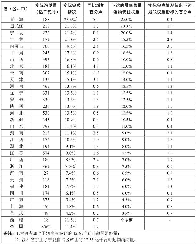 二、各省(區(qū)、市)可再生能源電力消納責任權(quán)重完成情況
