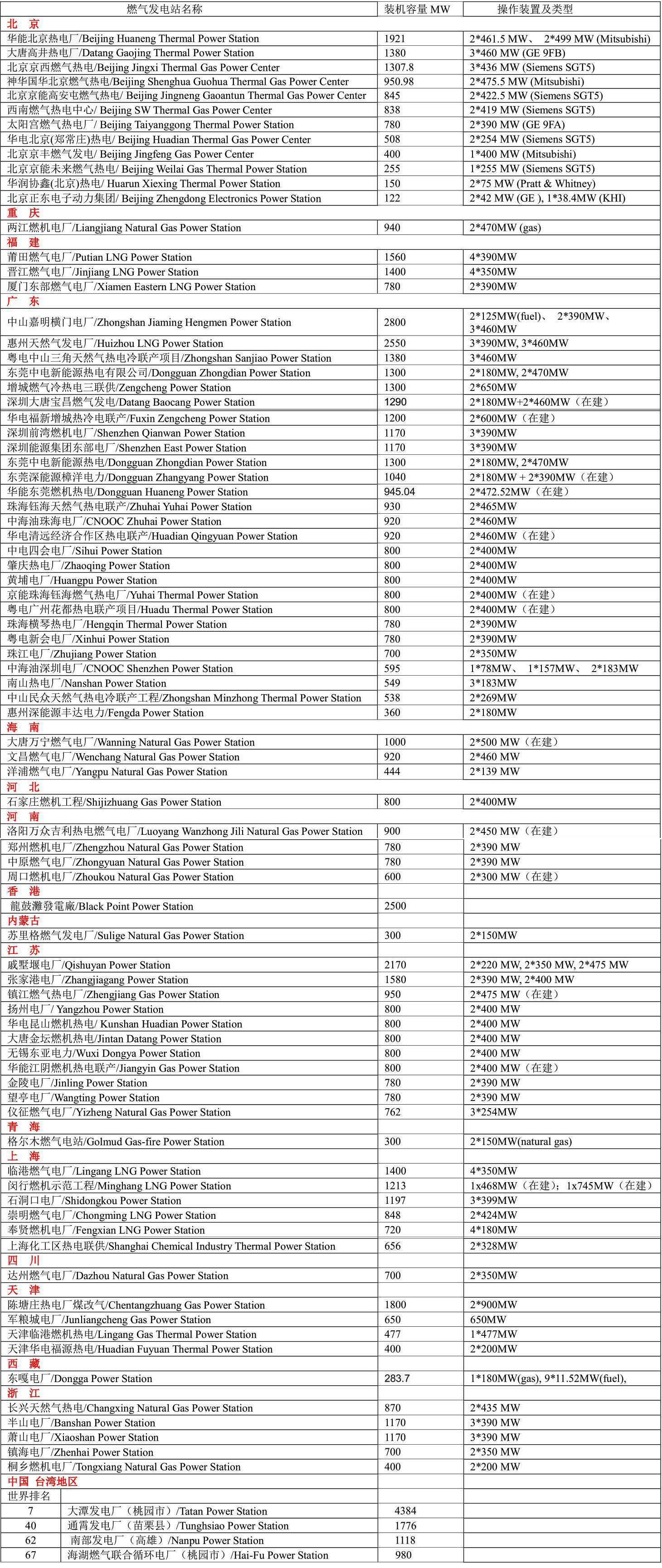 中國最大的燃氣發(fā)電站在中國臺灣地區(qū)—大潭發(fā)電廠(Tatan Power Station),其次是香港—龍鼓灘發(fā)電廠(Black Point Power Station)。