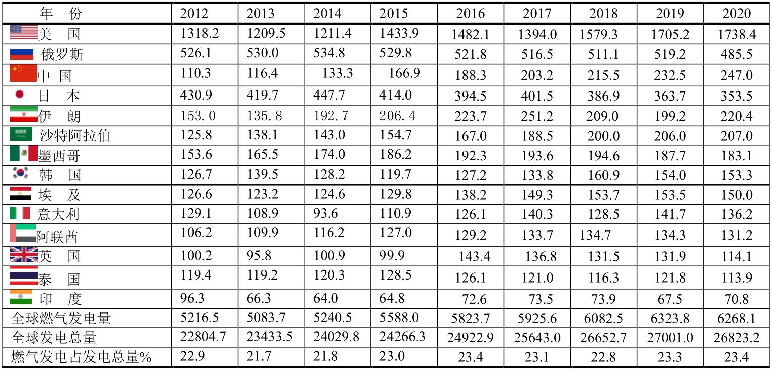 就全球發(fā)電而論,2020年燃煤發(fā)電居首位,占全球總量的9421.4/26823.2=35.1%;燃氣發(fā)電只居全球第二位,占全球總量的6268.1/26823.2=23.4%。