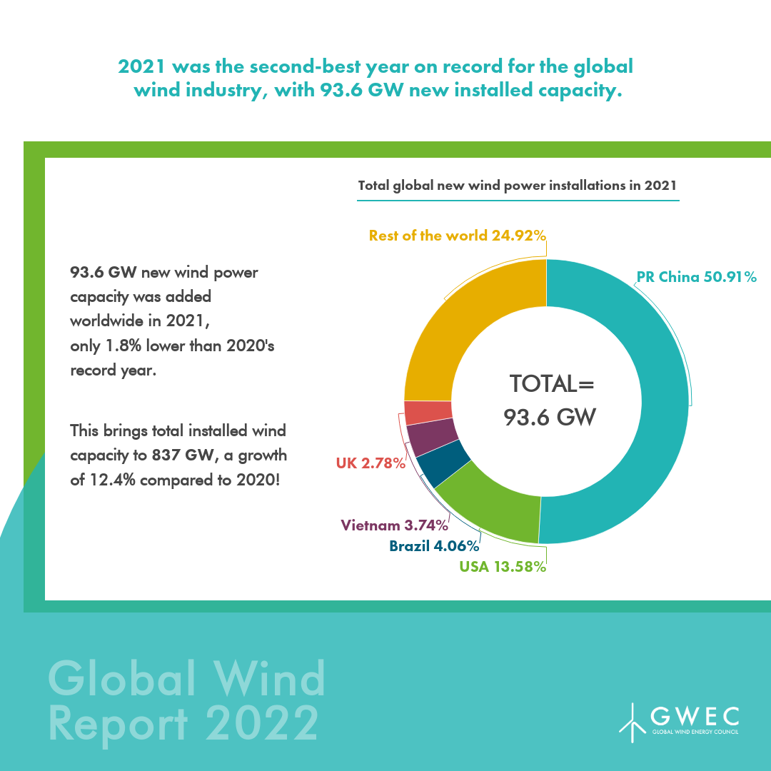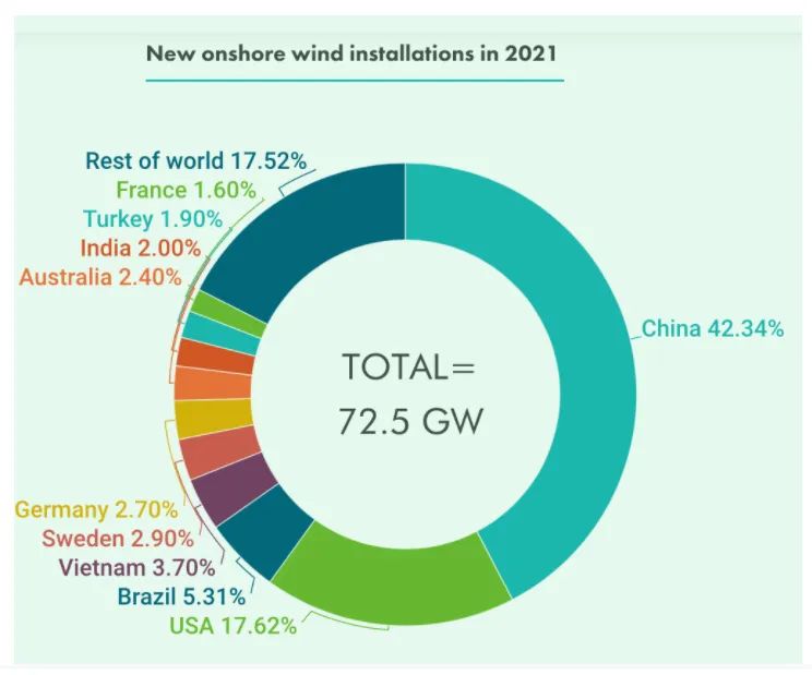 2021年全球風(fēng)電新增裝機(jī)93.6GW,具體國(guó)家排名如下: