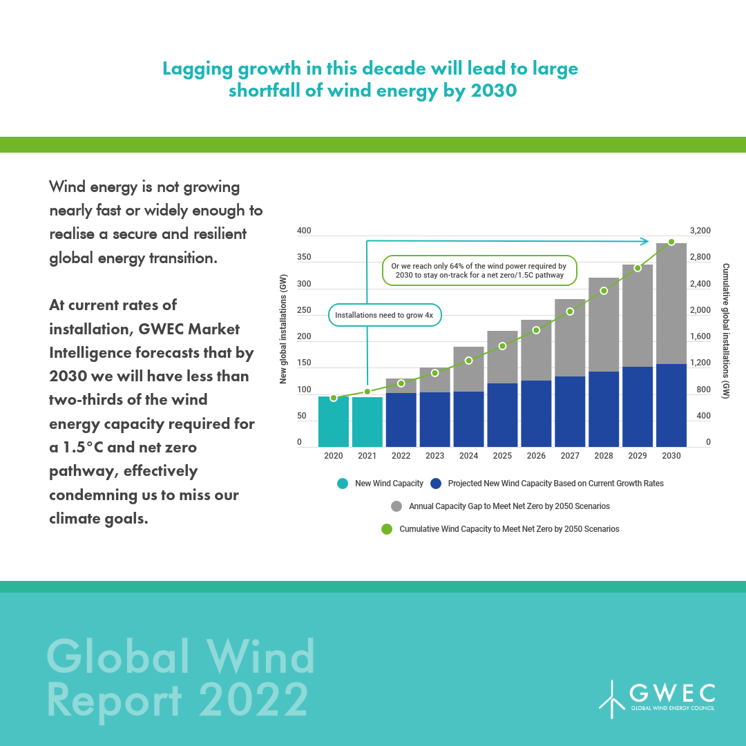 新冠疫情的影響顯而易見(jiàn),美國(guó)、印度、中國(guó)臺(tái)灣等市場(chǎng)的項(xiàng)目交付都有所放緩。但2021年的招標(biāo)活動(dòng)說(shuō)明加快風(fēng)電配置是很多國(guó)家的重要戰(zhàn)略。相比2020年,全球風(fēng)電招標(biāo)量上升了153%,達(dá)到88 GW,其中陸上風(fēng)電為69 GW(占78%),海上風(fēng)電為19GW。風(fēng)電正處在上升通道中,但若想實(shí)現(xiàn)安全且有彈性的全球能源轉(zhuǎn)型,現(xiàn)在的增長(zhǎng)速度和廣度都不夠。如果按照現(xiàn)在的發(fā)展速度,到2030年全球風(fēng)電裝機(jī)量將不足1.5℃情境及凈零排放路徑所需風(fēng)電容量的三分之二,這實(shí)際上將使我們無(wú)法實(shí)現(xiàn)氣候目標(biāo)。2021年全球陸上風(fēng)電新增裝機(jī)72.5GW,具體國(guó)家排名如下: