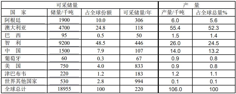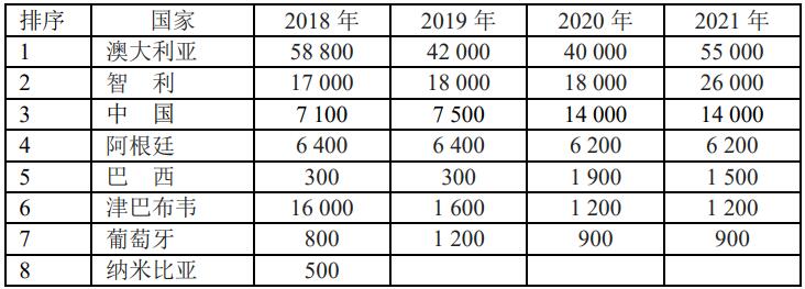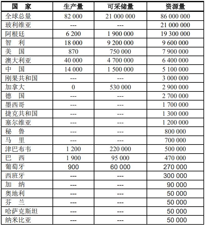 USGS:2020年底世界各國鋰礦的生產量、可采儲量和資源量(單位:噸)