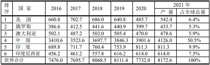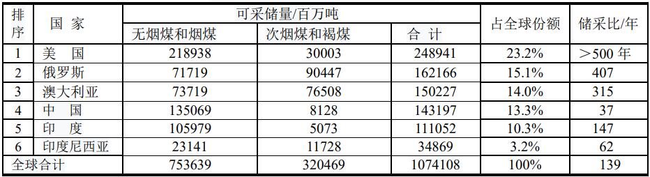 全球原煤可采儲量前6位國家的產量(單位:百萬噸)
