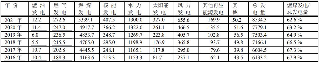 根據(jù)中國國家統(tǒng)計局的數(shù)據(jù),列出下表??梢匀菀卓闯觯袊茉词且匀济喊l(fā)電為主。中國燃煤發(fā)電量占中國發(fā)電總量的百分比在逐年降低。