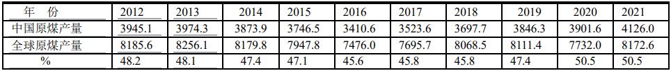 中國原煤產量占全球原煤產量的比例(單位:百萬噸)