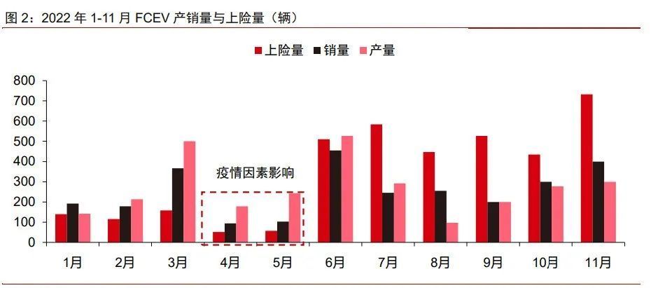 根據(jù)中汽協(xié)以及中信保數(shù)據(jù),2022年前11月FCEV產(chǎn)量為2969輛,銷量為 2789輛,上險總數(shù)為3755輛。2022年上半年產(chǎn)量一直大于銷量,主要系 2021年下半年確定燃料電池示范城市群政策,業(yè)內(nèi)熱情與預(yù)期較高。但是受制于疫情與補貼落地速度,銷量推進(jìn)速度較慢,形成了一定的庫存壓力。據(jù)氫云鏈微信公眾號數(shù)據(jù),2021年年底庫存量為280輛左右,今年7月庫存增加到750 輛,導(dǎo)致8月開始減產(chǎn)去庫存。從上險量數(shù)據(jù)看,2022年前5月上險量數(shù)據(jù)欠佳,6月上險量陡增,一方面是因為6月疫情相對緩和,前期被延遲的訂單出現(xiàn)了集中交付的情況;另一方面也與示范城市群首年推廣考核臨近(2022年8 月)有關(guān),但是除京津冀城市群以外,其他城市群第一年推廣進(jìn)度并不理想,2022年跟計劃相比“拖欠”的量,或在2023年釋放。