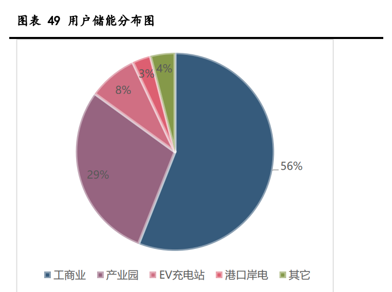 國(guó)內(nèi)用戶側(cè)儲(chǔ)能以工商業(yè)和產(chǎn)業(yè)園為主。2021 年國(guó)內(nèi)新型儲(chǔ)能中用戶側(cè)儲(chǔ)能占比 達(dá)到 24%,重要性愈發(fā)凸顯,細(xì)分應(yīng)用場(chǎng)景來(lái)看,國(guó)內(nèi)工商業(yè)和產(chǎn)業(yè)園占據(jù)了絕對(duì)主力, 合計(jì)占比超過 80%,是用戶側(cè)應(yīng)用的主流用途。