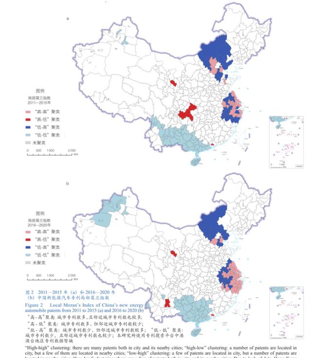 圖2進一步說明了專利申請的空間集聚現(xiàn)象具體的空間分布特征。① 與北京市鄰近的天津市、保定市和張家口市均為“高-高”聚類地區(qū),但同時也存在唐山市、廊坊市等“低-高”聚類地區(qū)。這反映出北京市作為新能源汽車研發(fā)的核心城市,對其鄰近城市具有一定的知識溢出效應(yīng),但其溢出具有較為明顯的指向性——雖然部分城市對于北京市地理鄰近,但北京市知識溢出并沒有對其產(chǎn)生較為明顯的影響。② 在長江三角洲城市群地區(qū)具有顯著新能源汽車專利空間集聚現(xiàn)象,以上海市、南京市、杭州市和寧波市等為代表的城市形成了“高-高”聚類的連片區(qū)。同時,比較2011—2015年和2016—2020年的局部莫蘭指數(shù)空間格局可以發(fā)現(xiàn),在2011—2015年,屬于“高-高”聚類的城市外圍存在大量屬于“低-高”聚類的城市,主要分布于浙江省南部、江蘇省北部和安徽省東部;而隨著新能源汽車產(chǎn)業(yè)的發(fā)展,這些城市逐漸從“低-高”聚類轉(zhuǎn)變?yōu)?ldquo;高-高”聚類,“低-高”聚類區(qū)進一步向外圍延伸,這表現(xiàn)出顯著的依托地理鄰近性的知識溢出效應(yīng)。③ 廣東省西部、廣西壯族自治區(qū)和云南省存在連片的“低-低”聚類區(qū)。這3個省份均擁有一定的汽車制造業(yè)基礎(chǔ),但涉及新能源汽車的企業(yè)相對較少。盡管廣東省擁有比亞迪等重要新能源汽車企業(yè),但其知識溢出也僅局限于粵港澳大灣區(qū),難以產(chǎn)生較為明顯的地理鄰近上的知識溢出。