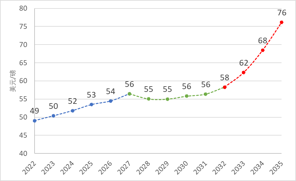2023-2035年天然鈾年度現(xiàn)貨價(jià)預(yù)測(cè)