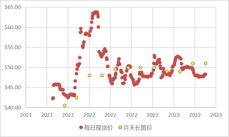 2022年1月-2022年12月現(xiàn)貨價(jià)和長(zhǎng)貿(mào)價(jià)