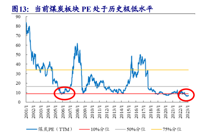 煤炭板塊PE處于歷史極低位。截至2023年3月10日,煤炭板塊市盈率PE(TTM)為6.70倍,遠(yuǎn)低于歷史估值10%分位。歷史上,煤炭板塊PE低位出現(xiàn)在2005年,2008年,2014年及2020年。2005年12月,煤炭板塊PE階段性低點(diǎn)為8.35倍,比當(dāng)前PE高24.6%。2008年10月,煤炭板塊PE階段性低點(diǎn)為9.41倍,比當(dāng)期PE高40.4%。2014年3月,煤炭板塊PE階段性低點(diǎn)為9.07倍,比當(dāng)期PE高35.4%。2020年3月23日,煤炭板塊PE階段性低點(diǎn)為7.09倍,比當(dāng)期PE高5.8%。從基本面看,2005年煤炭行業(yè)盈利向好,煤價(jià)經(jīng)歷2004年的上漲后維持高位,PE低位主因股市整體低迷;2014年煤炭供給嚴(yán)重過(guò)剩,煤企利潤(rùn)大幅下滑,虧損面擴(kuò)大,盈利下降導(dǎo)致PE低位;2020年疫情突發(fā),股市大幅波動(dòng),煤炭板塊出現(xiàn)PE低點(diǎn)。從歷史PE看,2005年、2008年、2013-2014年、2020年,煤炭板塊PE都出現(xiàn)相對(duì)低點(diǎn),2008年主因金融危機(jī),股市出現(xiàn)大幅波動(dòng),2013年-2014年煤炭行業(yè)進(jìn)入低谷,低盈利導(dǎo)致低PE,2020年主因突發(fā)疫情,能源價(jià)格出現(xiàn)大跌。但相比于行業(yè)低谷于突發(fā)事件期間,當(dāng)前煤炭板塊高盈利、低PE,基本面更接近于2005年的高盈利時(shí)期,但PE仍遠(yuǎn)低于當(dāng)時(shí)低點(diǎn)。當(dāng)前煤炭板塊PE已處于歷史區(qū)間谷底,主因2021年以來(lái)煤炭板塊業(yè)績(jī)持續(xù)增長(zhǎng),而煤炭板塊價(jià)值被嚴(yán)重低估。
