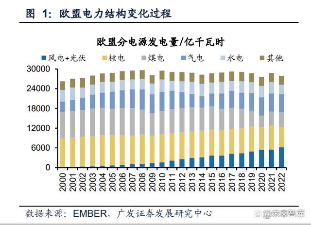 (4)棄核立場(chǎng)導(dǎo)致核電占比大降:德國(guó)退核態(tài)度堅(jiān)決,法國(guó)核電發(fā)電量亦有所下降, 歐盟核電發(fā)電量相比21世紀(jì)初已大幅下滑,尤其是2022年德國(guó)繼續(xù)關(guān)停核電站以及 法國(guó)核電大面積停運(yùn)檢修進(jìn)一步加劇了歐盟發(fā)電量的緊張情況;