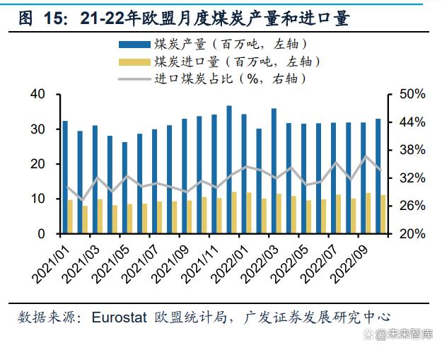 電煤需求降低、庫(kù)存增加,歐盟增量煤炭需求或?qū)⑾禄?022年歐盟電煤消費(fèi)量增 加帶動(dòng)煤炭消費(fèi)量提升,1-8月電煤消費(fèi)量同比提升16.2%,煤炭消費(fèi)量同比提升 8.8%,非電煤消費(fèi)量同比下降5.1%;9月后電煤消費(fèi)量同比出現(xiàn)下滑,與煤電發(fā)電 量走勢(shì)一致,9月、10月電煤消費(fèi)量分別同比下降0.9%、2.6%,煤炭消費(fèi)量同比下 滑5.1%、6.6%。從煤炭供給量和消費(fèi)量對(duì)比來(lái)看,2021年歐盟煤炭產(chǎn)量+進(jìn)口量?jī)H 超出煤炭消費(fèi)量163萬(wàn)噸,2022年,歐盟增加煤炭供給量,1-10月煤炭產(chǎn)量+供給量 合計(jì)4.32億噸,而消費(fèi)量為4.15億噸,增加庫(kù)存1721萬(wàn)噸,庫(kù)存增加、需求降低將 導(dǎo)致2023年歐盟增量煤炭需求下滑。