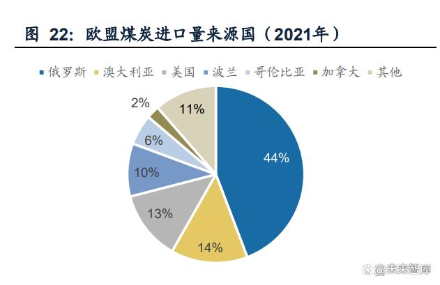 歐盟化石能源進(jìn)口高度依賴俄羅斯,2021年歐盟煤炭、天然氣進(jìn)口量中分別44%、 41%來(lái)自俄羅斯,俄烏沖突導(dǎo)致歐洲面臨能源價(jià)格和供應(yīng)的雙重危機(jī)。長(zhǎng)遠(yuǎn)來(lái)看, 歐盟實(shí)現(xiàn)能源獨(dú)立將從兩方面著手:一是多元化進(jìn)口天然氣氣源,二是加速能源轉(zhuǎn) 型,提高能效,減少對(duì)化石能源的依賴,歐盟對(duì)煤炭的需求或?qū)⒊掷m(xù)下降。 煤炭:歐盟的煤炭供給量逐年下降至2021年的4.87億噸,較2000年的8.31億噸減少 41.4%,同時(shí)同步減少煤炭本土產(chǎn)量和進(jìn)口量,對(duì)外依存度保持在20%~25%。從煤 炭進(jìn)口來(lái)源看,歐盟煤炭前三大進(jìn)口國(guó)是俄羅斯(占比44%)、澳大利亞(占比14%)、 美國(guó)(占比13%);德國(guó)和波蘭為本土的產(chǎn)煤大國(guó),合計(jì)產(chǎn)量占?xì)W盟總產(chǎn)量的70%。