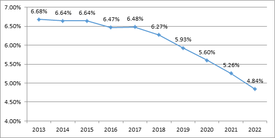 據(jù)中電聯(lián)快報(bào)數(shù)據(jù),2022年全國(guó)線損率4.84%,同比下降0.42個(gè)百分點(diǎn),保持繼續(xù)下降走勢(shì),較2013年下降了1.84個(gè)百分點(diǎn)。